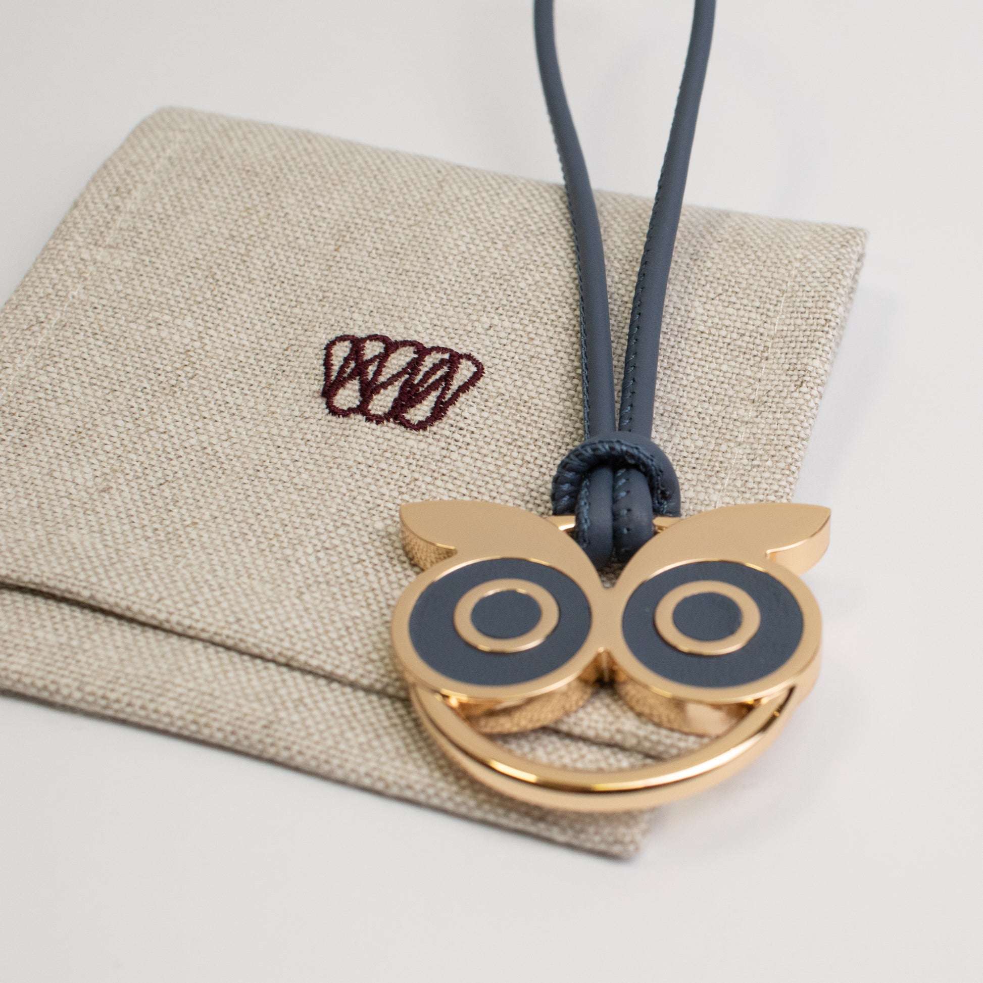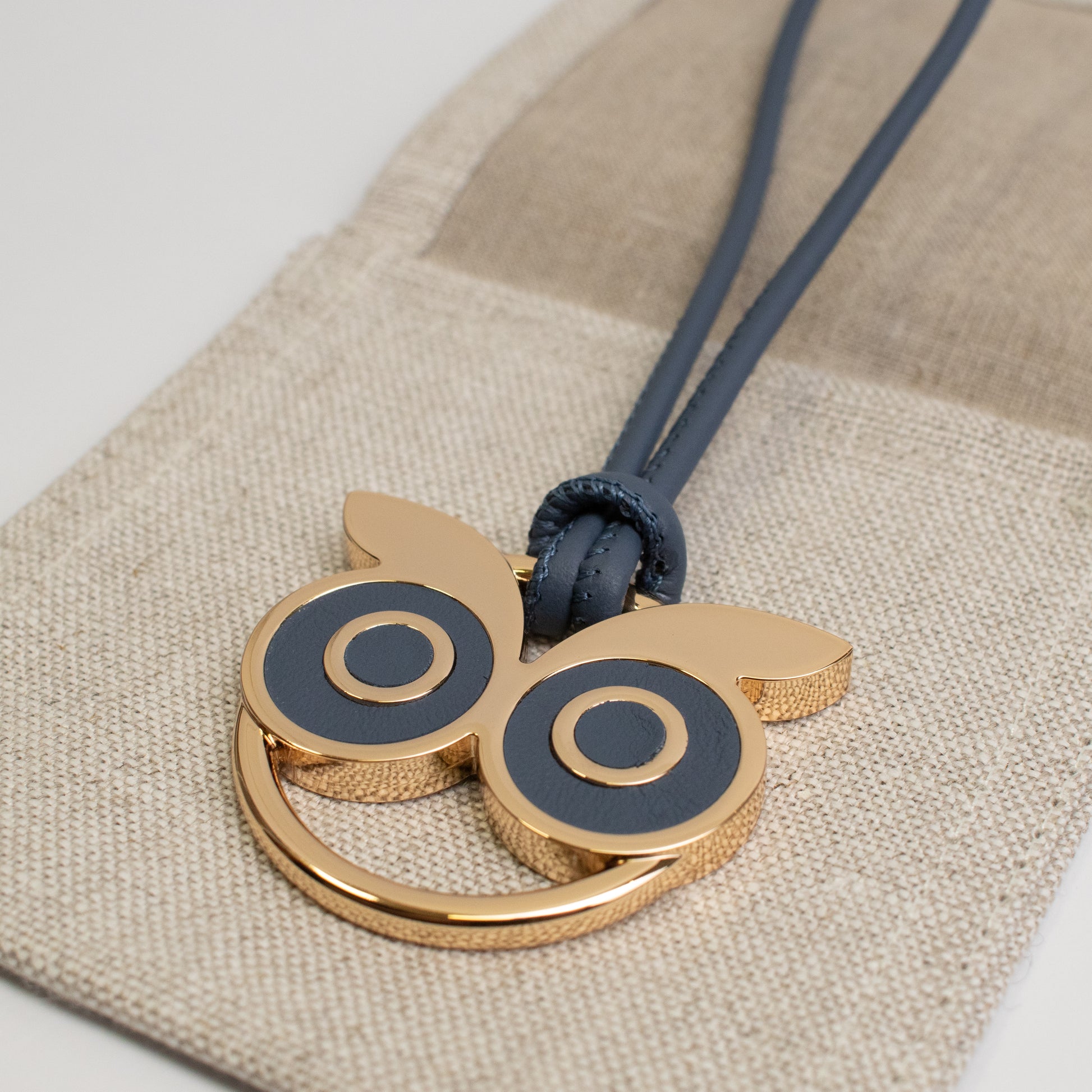 A golden charm celebrating the majestic owl in its nocturnal world. Dusky blue eyes and tie in rescued calf leather. Engraved on reverse with "Wisdom Begins in Wonder". Handcrafted in Italy.