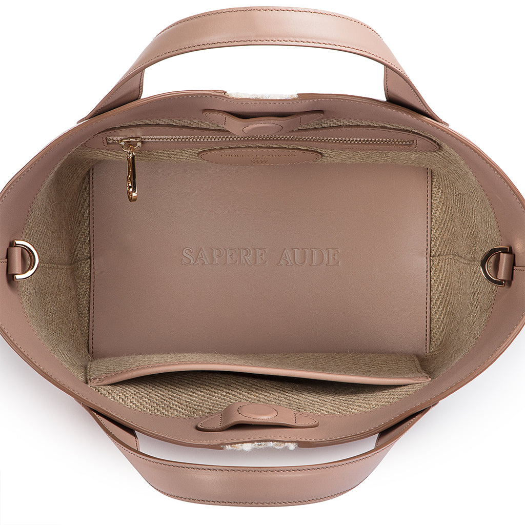 This small Gloriana Tote is part of a limited edition of just 10 pieces. Crafted from Italian calfskin in Roselawn—a soft, powdered mauve-pink with elegant warmth—it’s a serene piece with a distinctly feminine edge. Finished with a pale ivory tweed panel and matching leather strap, and fully lined in breathable Irish linen, the Gloriana brings gentle refinement to everyday style—perfect whether carried by hand or on the shoulder.