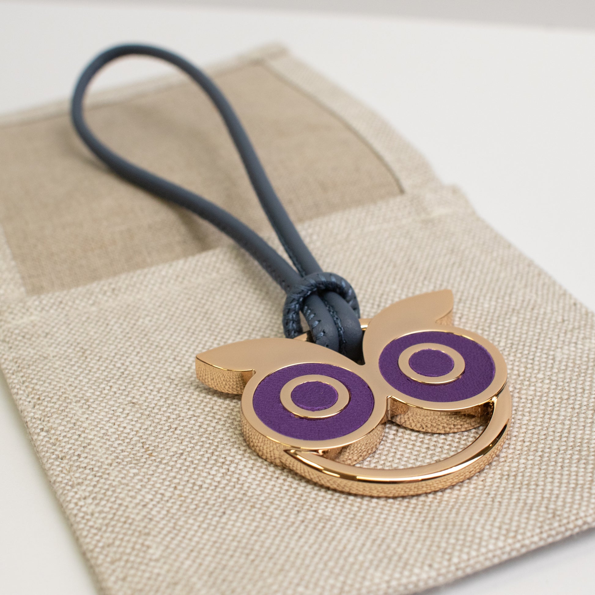 A golden charm celebrating the majestic owl in its nocturnal world. Mysterious purple eyes and dusky blue tie in rescued calf leather. Engraved on reverse with "Wisdom Begins in Wonder". Handcrafted in Italy.