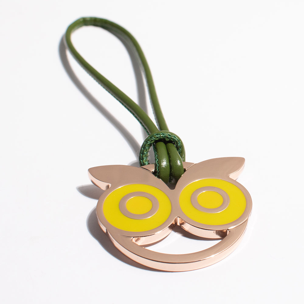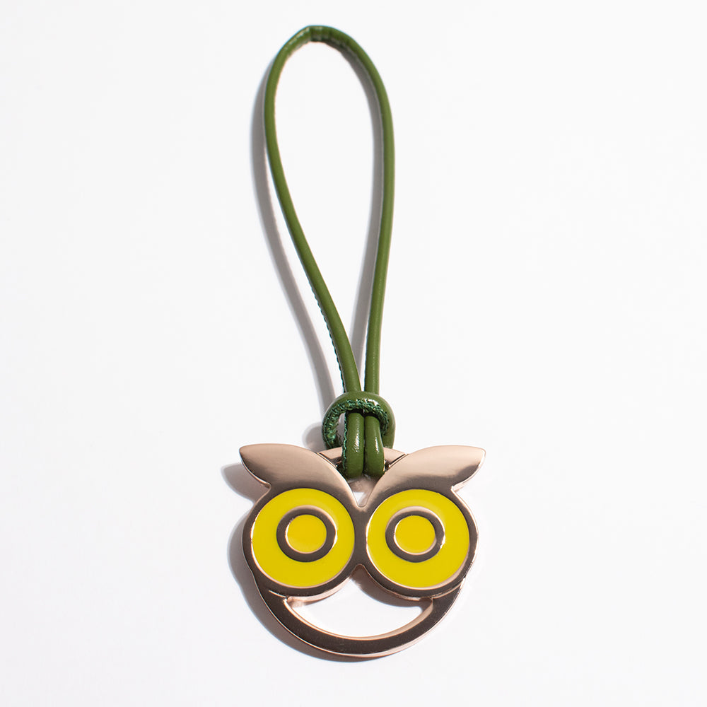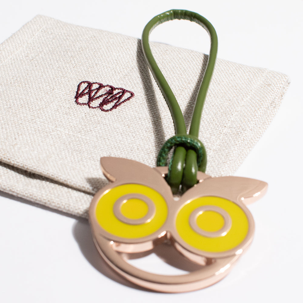 A golden ceramic-eyed owl charm celebrating radiance. Luminous yellow eyes with verdant green rescued calf-leather tie. Engraved on reverse with "Wisdom Begins in Wonder". Handcrafted in Italy.